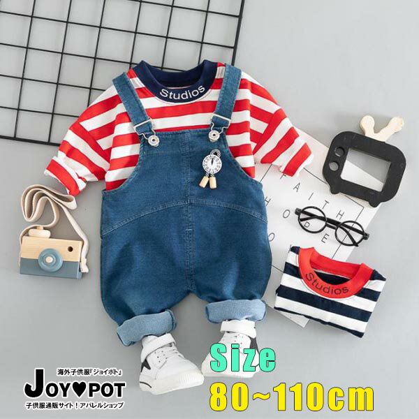 キッズ ベビー服 上下セット 子供服 セットアップ 長袖 海外 輸入 デニム オーバーオール ボーダー柄 男の子 女の子 秋 冬 春 ジュニア おそろい 洋服 オシャレ 80cm 90cm 100cm 110cm