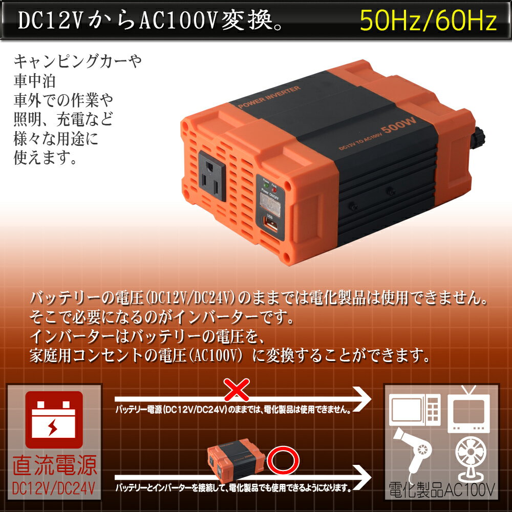 商品説明 【商品仕様】 12V定格 500W 瞬間1000W 50/60Hz共通 高出力インバーター ○入力電圧:DC12V ○出力電圧:AC100V ○定格出力:500W ○最大出力:1000W ○出力周波数:50Hz/60Hz切替 ○出力仕様:ACコンセント(1口) ○出力波形:矩形波(擬似正弦波) ○USB出力:DC5V/1.0A ○使用温度環境:-10℃〜40℃ ○本体素材:アルミ ○本体サイズ(約):183×68×117mm ○重量(約):690g 【商品機能】 ○回路保護 ○入力低電圧警報音 ○低電圧遮断 ○過温度遮断 ○過負荷遮断 ○短絡遮断 ○入力過電圧保護 ○入力逆接続保護機能 商品内容 本体 × 1 ワニクリップ 赤 × 1本 黒 × 1本 日本語説明書 × 1 ※USBケーブルは付属しておりません。