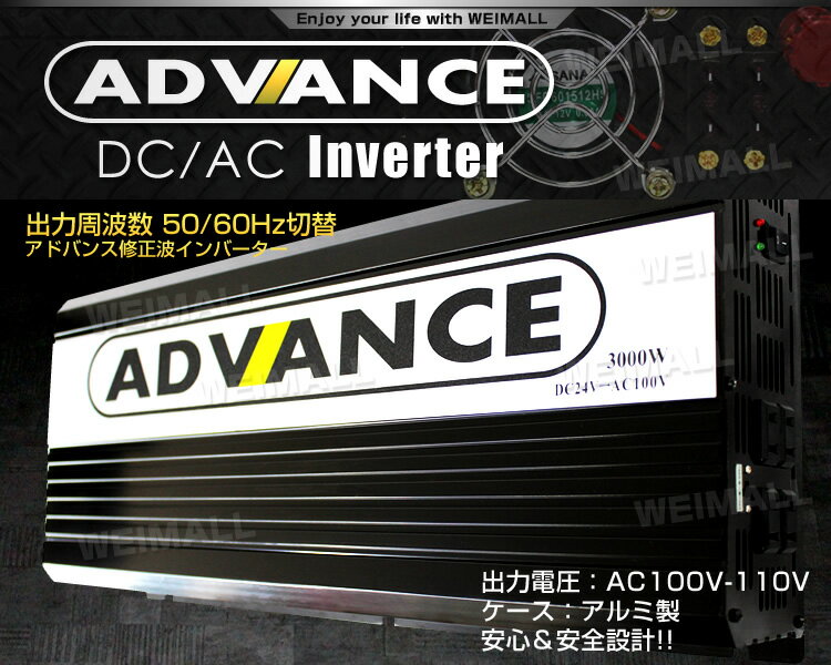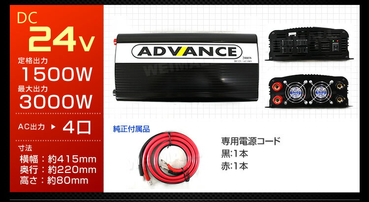 バッテリーの直流24Vを交流100Vに変換! コンセント4個付で同時に4台の電化製品が使用可能! アウトドアはもちろん、緊急時や災害時などにも大活躍! 商品仕様 寸法:410mm(L)×220mm(W)×80mm(H) AC100Vコンセント ×4 入力電圧:DC24V 出力電圧:AC100V 定格出力:2000w 最大出力:4000w 出力周波数:スイッチで50Hz/60Hz 変換可能 出力波形:矩形波(疑似正弦波) ケース:アルミ製 商品機能 回路保護 入力低電圧警報音 低電圧遮断 過温度遮断 過負荷遮断 短絡遮断 入力過電圧保護 入力逆接続保護機能 商品内容 インバーター本体 ×1 電源コード ×2 ▼検索キーワード インバーター 12V 24V 100V 修正波 矩形波 疑似正弦波 DC-ACインバーター 非常用電源 緊急 アウトドア 防災グッズ 防災用品 対策 家庭用電源 パソコン スマートフォン 携帯電話 発電機 アウトドア 人気 おすすめ 送料無料 WEIMALL