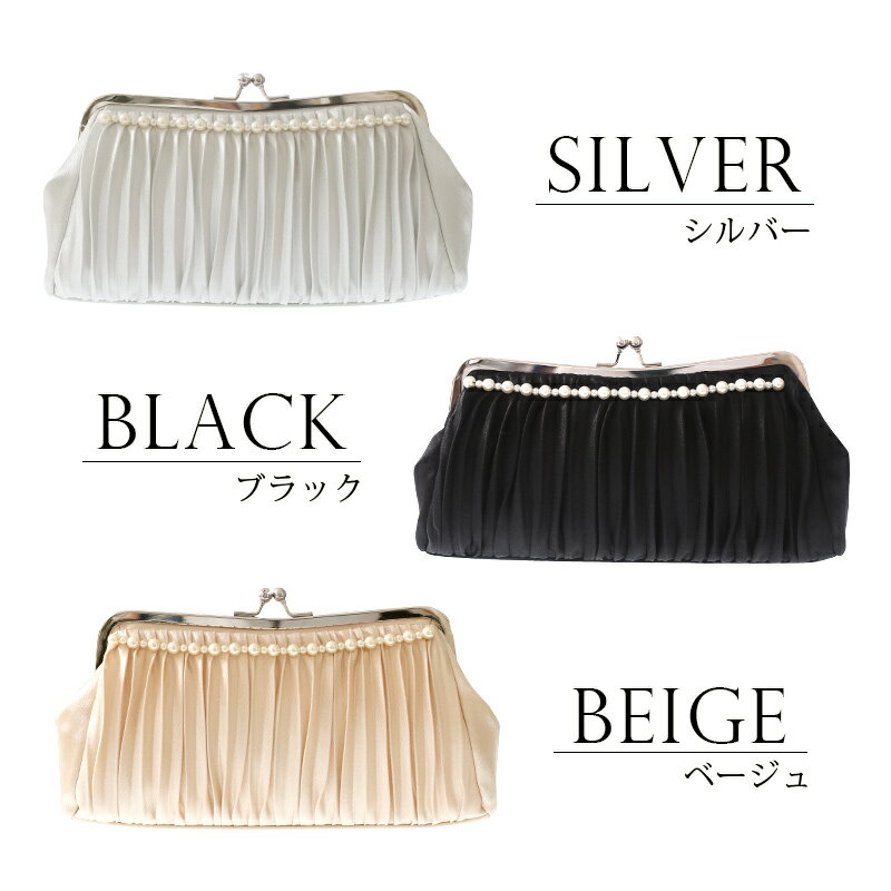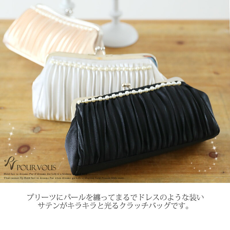 プリーツにパールを纏ってまるでドレスのような装い サテンがキラキラと光るクラッチバッグです。